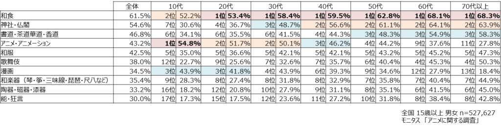 誇りに思う日本の文化について、年代別にみると10代では「アニメ」が1位(54.8%)、20代、30代でも「アニメ」は5割を超え、2位の位置づけとなりました。