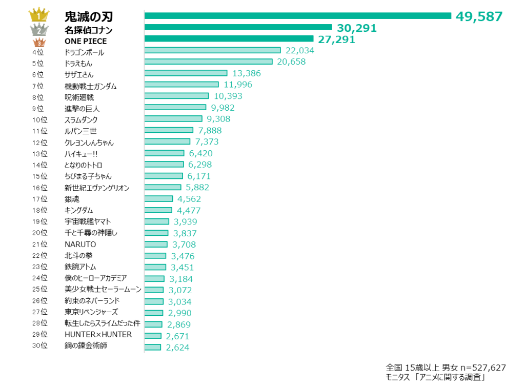 多くのシリーズが出ている「機動戦士ガンダム」や「ルパン三世」、「クレヨンしんちゃん」、国民的アニメの「ドラえもん」や「サザエさん」もありながら、「鬼滅の刃」が圧倒的1位なのは人気の高さが伺えます。