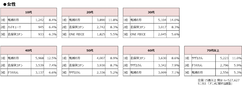 男性は、10代で「呪術廻戦」がランクイン。30代・40代では「ドラゴンボール」、40代・50代は「機動戦士ガンダム」、60代以降では、「鉄腕アトム」がTOP3入りしています。これに対し、女性は10代で「ハイキュー!!」がランクイン。また、10代から60代まで「名探偵コナン」がランクインしており、「鬼滅の刃」同様、幅広い年代から指示されていることがわかります。