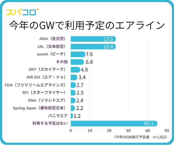 一方で「利用する予定はない」は45%で、半数以上が今年のGWに飛行機を利用することがわかりました。