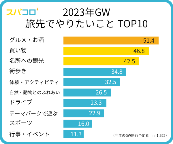 旅行予定者に聞いた旅先でやりたいことでは、「グルメ・お酒」(51.4%)でした。次いで「買い物」(46.8%)、「名所への観光」(42.5%)、「街歩き」(34.8%)と続きます。