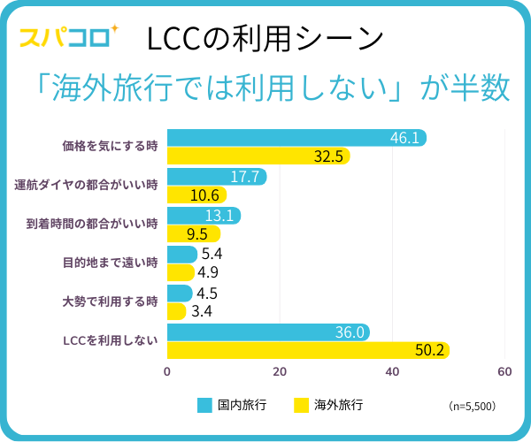「LCCを利用しない」と回答した人は国内旅行では36.0%、海外旅行だと50.2%と半数を占めました。