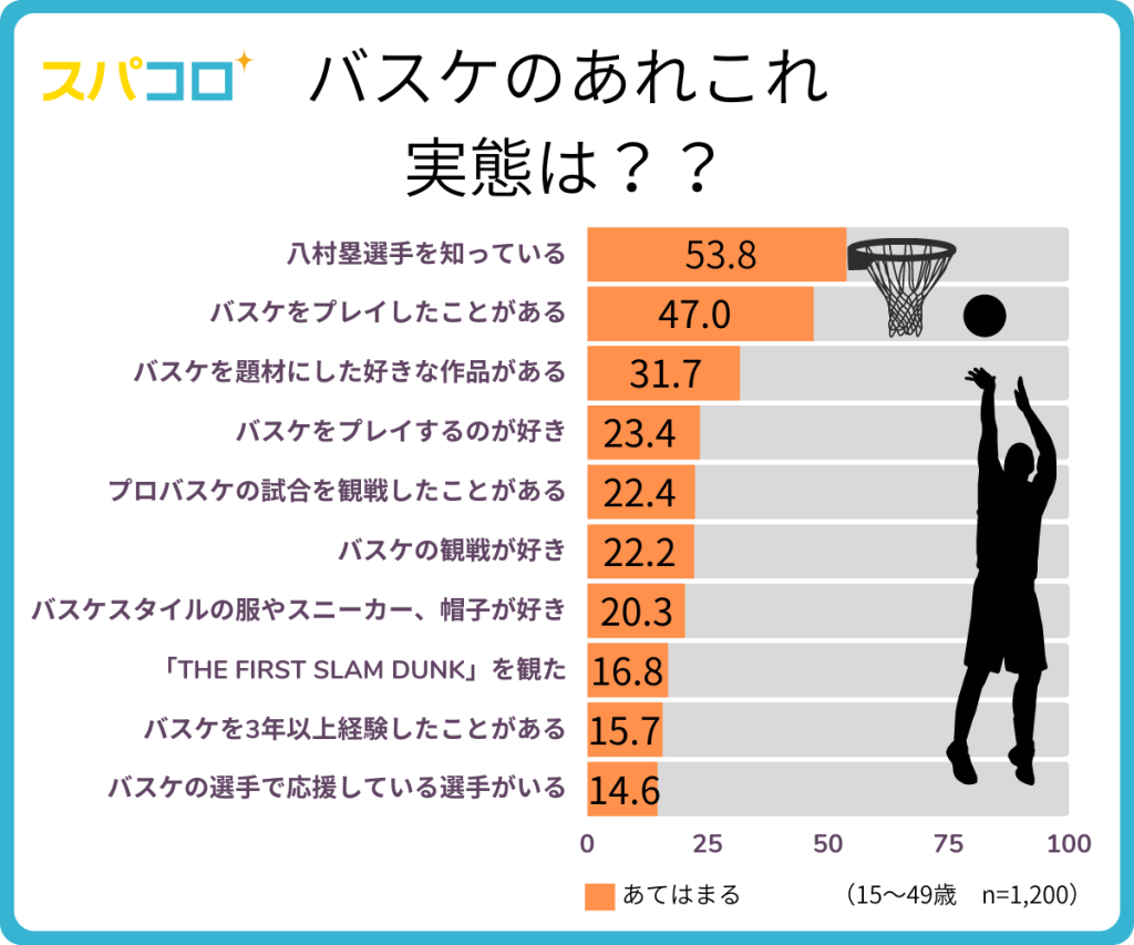■バスケにまつわる実態では「八村塁選手を知っている」(53.8%)、「体育の授業や遊びでバスケットボールをプレイしたことがある」(47.0%)、「バスケットボールを題材にした漫画・アニメ・映画で好きな作品がある」(31.7%)、「THE FIRST SLAM DUNKを観た」(16.8%)、「バスケスタイルの服やスニーカー、帽子が好き」(20.3%)。
