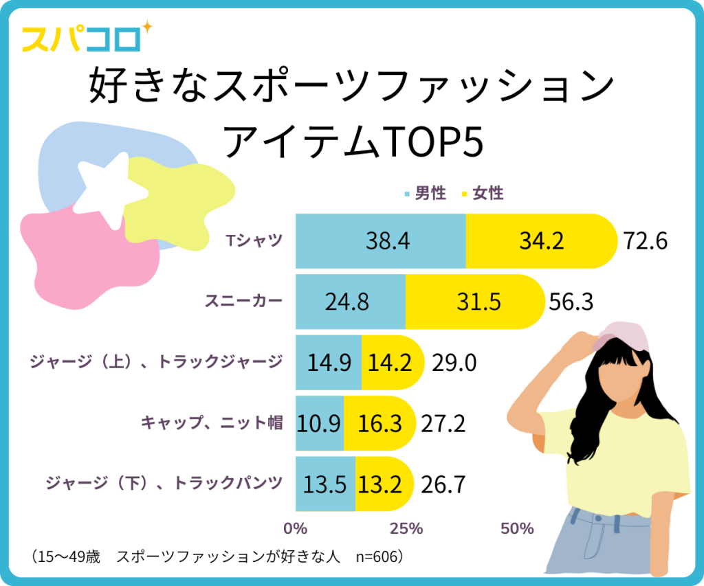 スポーツファッションが好きと回答した人に聞いた、好きなアイテムTOP3は「Tシャツ」(72.6%)、「スニーカー」(56.3%)、「ジャージ(上)、トラックジャージ」(29.0%)、「キャップ、ニット帽」(27.2%)、「ジャージ(下)、ドラックパンツ」(26.7%)でした。