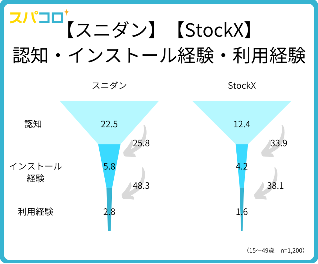 ■スニーカーダンクは認知率(22.5%)、DL率(5.8%)、利用経験率(2.8%)。StockXは認知率(12.4%)、DL率(4.2%)、利用経験率(1.6%)