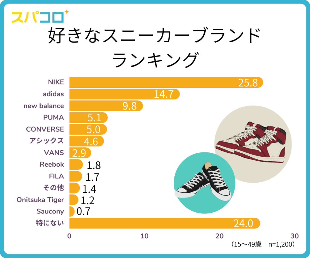 好きなスニーカーブランドTOP5は「NIKE(ナイキ)」(25.8%)、「adidas(アディダス)」(14.7%)、「new balance(ニューバランス)」(9.8%)、「PUMA(プーマ)」(5.1%)、「CONVERSE(コンバース)」(5.0%)でした。