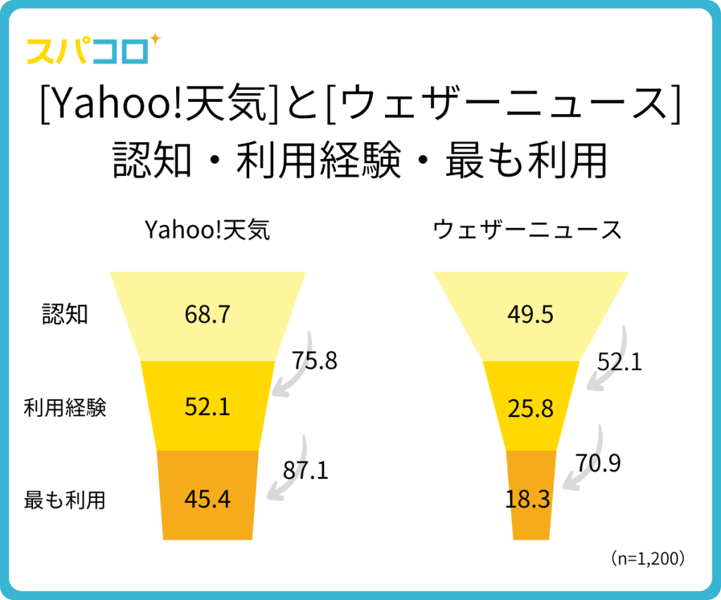天気アプリで利用率の高かった「Yahoo!天気アプリ」と「ウェザーニュース」を比較すると、認知率・利用経験率・最も利用している人の割合のすべてで「Yahoo!天気」が大きく上回る結果となりました。ユーザーが認知してからアプリを利用し、最も利用するに至るまで一貫して高い割合をキープしており、「Yahoo!天気アプリ」のサービス離脱者の少なさが伺えます。