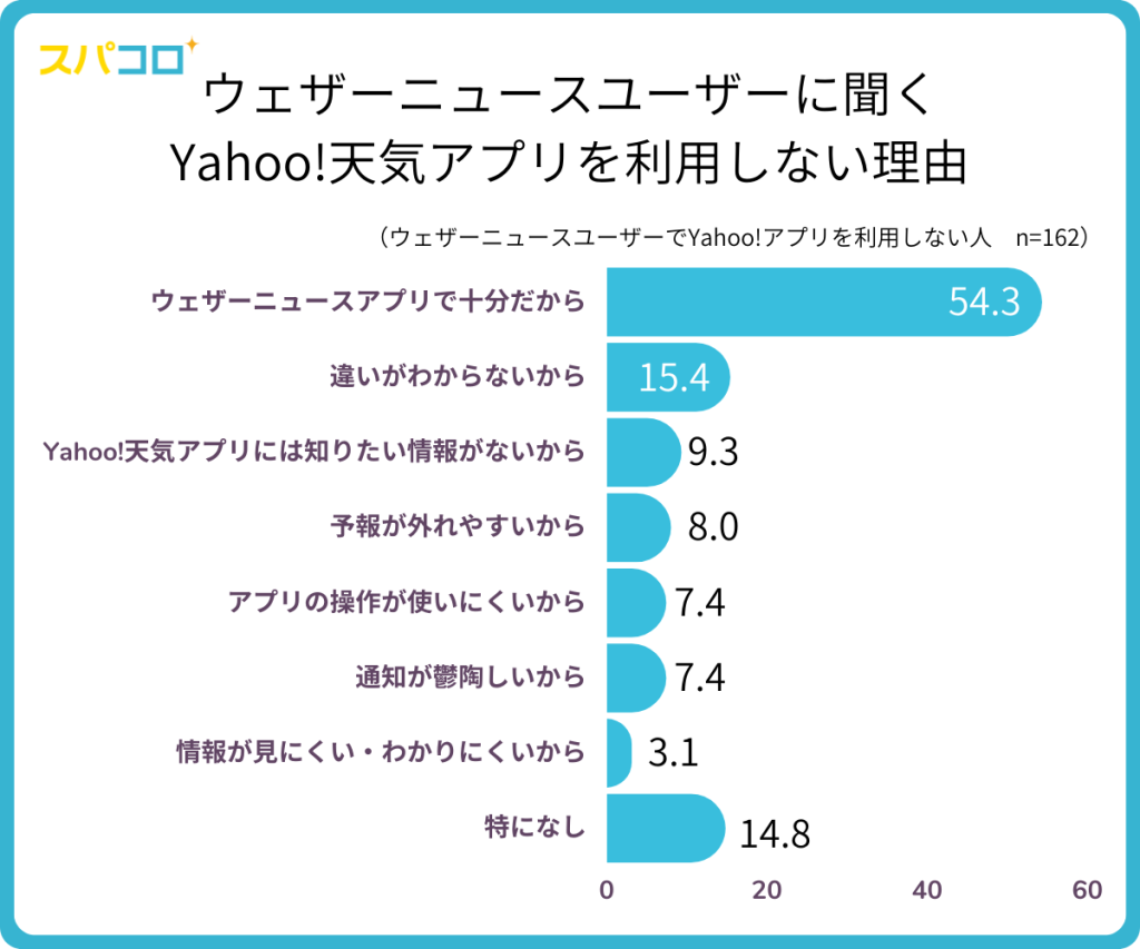 Yahoo!天気アプリをを利用しない理由TOP5は、「ウェザーニュースアプリで十分だから」(54.3%)でした。次いで「違いがわからないから」(15.4%)、「Yahoo!天気アプリには知りたい情報がないから」(9.3%)、「予報が外れやすいから」(8.0%)、「アプリの操作が使いにくいから」(7.4%)でした。)