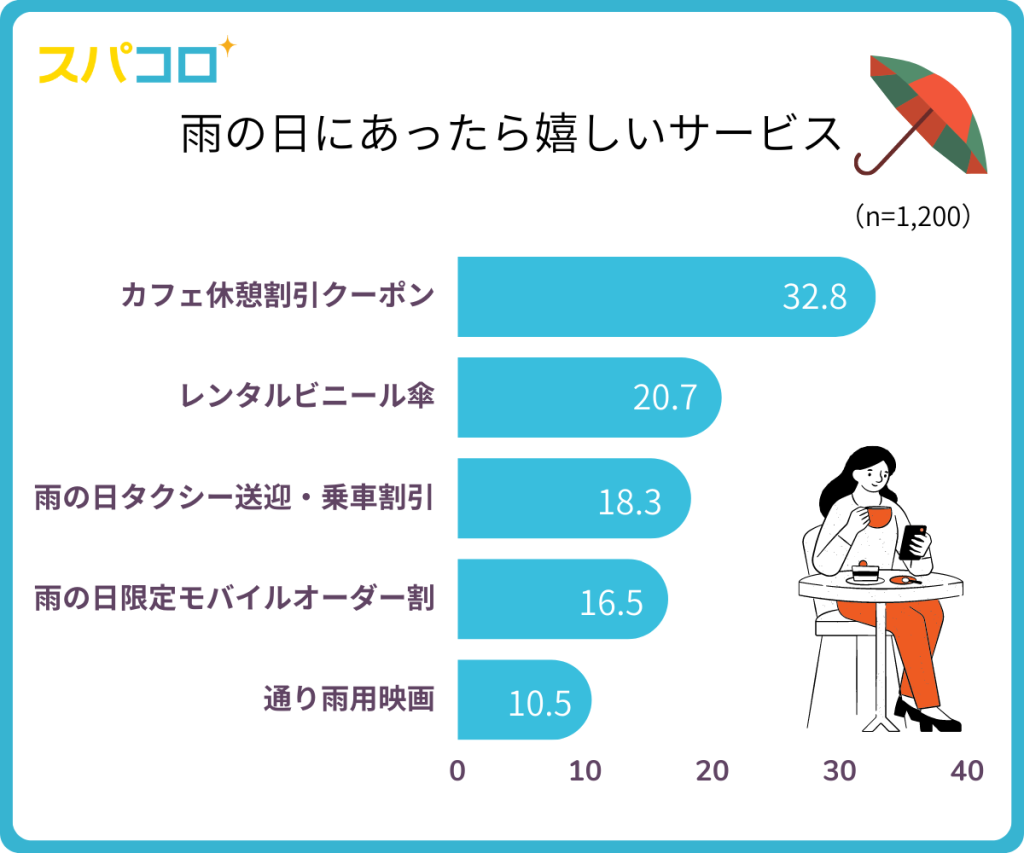 雨の日にあったら嬉しいサービスTOP5は「カフェ休憩割引クーポン」(32.8%)、「レンタルビニール傘」(20.7%)、「雨の日タクシー送迎・乗車割引」(18.3%)、「雨の日限定モバイルオーダー割」(16.5%)、「通り雨用映画」(10.5%)でした。