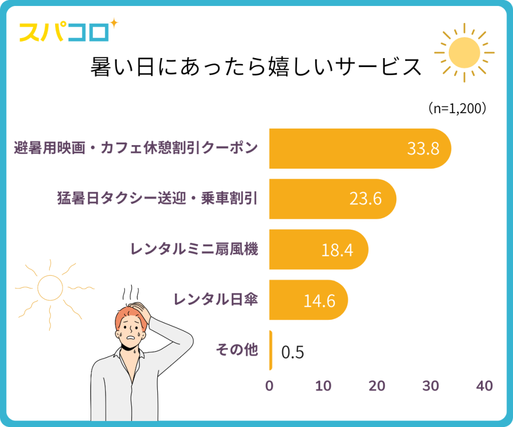 逆に暑い日にあったら嬉しいサービスTOP5は「避暑用映画・カフェ休憩割引クーポン」(33.8%)、「猛暑日タクシー送迎・乗車割引」(23.6%)、「レンタルミニ扇風機」(18.4%)、「レンタル日傘」(14.6%)、「その他」(0.5%)でした。