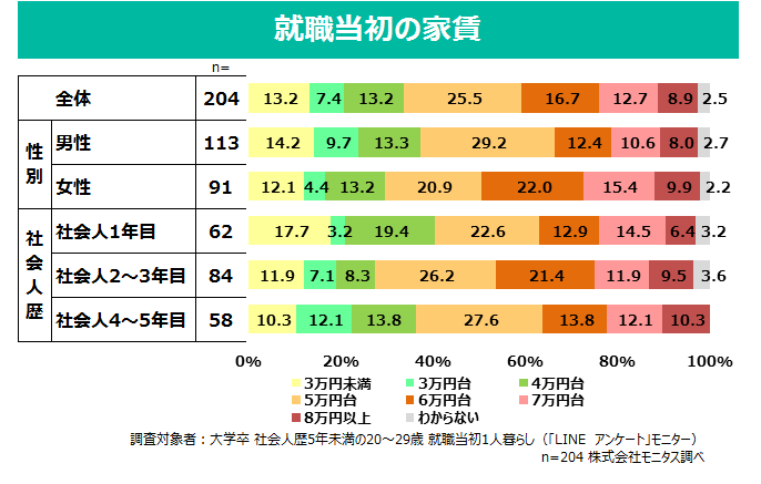 男性にくらべ女性の方が「実家ぐらし」の割合が高い。 - 1人ぐらしの新社会人の就職当初の家賃について、