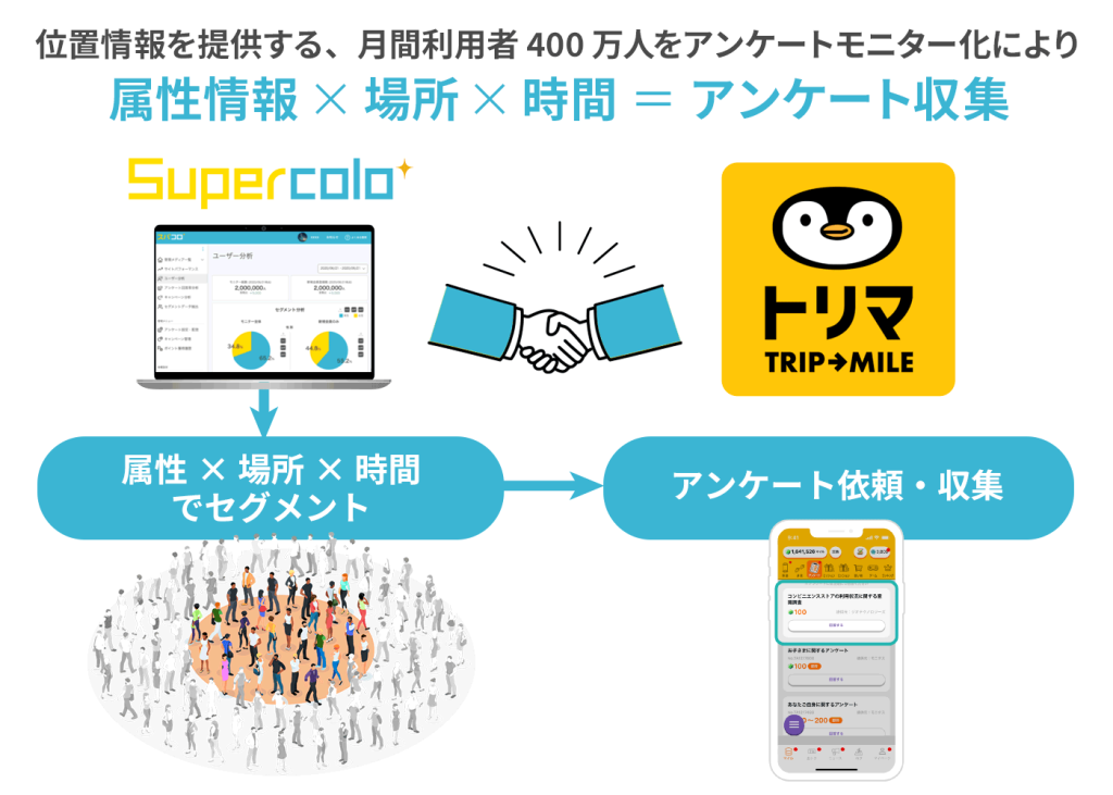 これまでのターゲティングリサーチでは、位置情報を保有する企業に調査を委託することが多く、調査実施までの時間やコストが大きくなってしまうことが課題でした。そこで、ジオテクノロジーズが運営するダウンロード数1,700万を誇るポイ活アプリ「トリマ」で収集保有するデータ資産(位置情報・属性)を活用した「Geo-Research」と、モニタスのスパコロシステムを掛け合わせて、アンケートを実施したい企業が自ら、特定のエリアに絞り込んで、短時間でアンケート回答を収集できるリサーチサービスを開発しました。